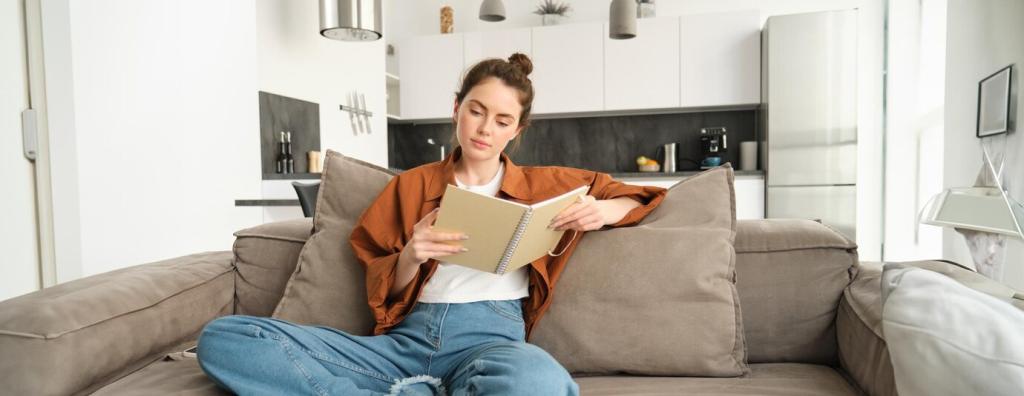 Eine rollbare Bibliotheksleiter spart Platz und verleiht Charakter. Achten Sie auf stabile Führungsschienen und rutschfeste Stufen. Kleine Messinghaken für Lesezeichen oder Bilderleisten mit Lieblingscovern geben Ihrer Heim-Bibliothek unaufdringlich Persönlichkeit.